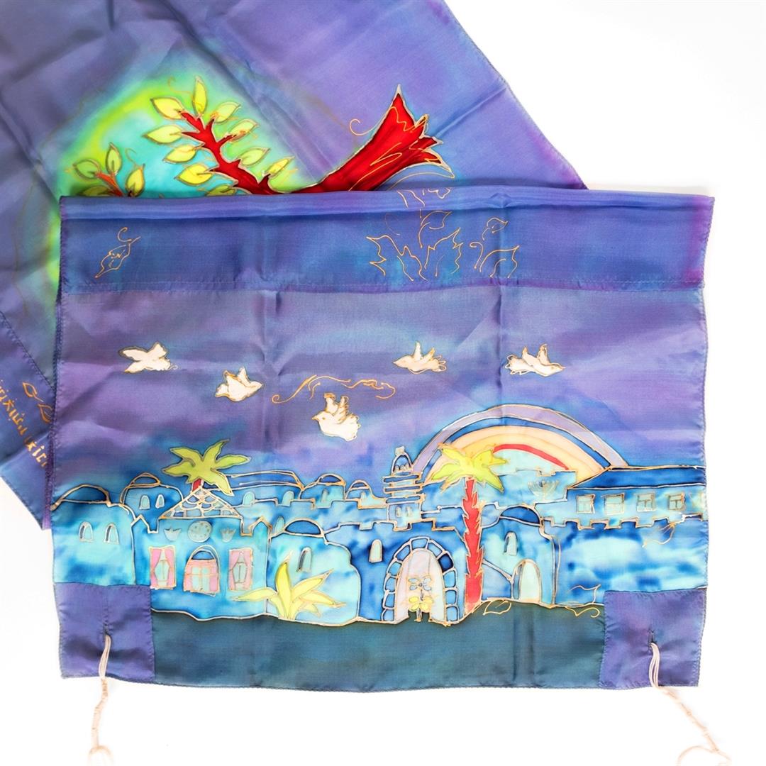 On the back of the tallit is the magnificent Tree of Life. On the sides of the tallit are colorful Jerusalem scenes with doves and a rainbow.