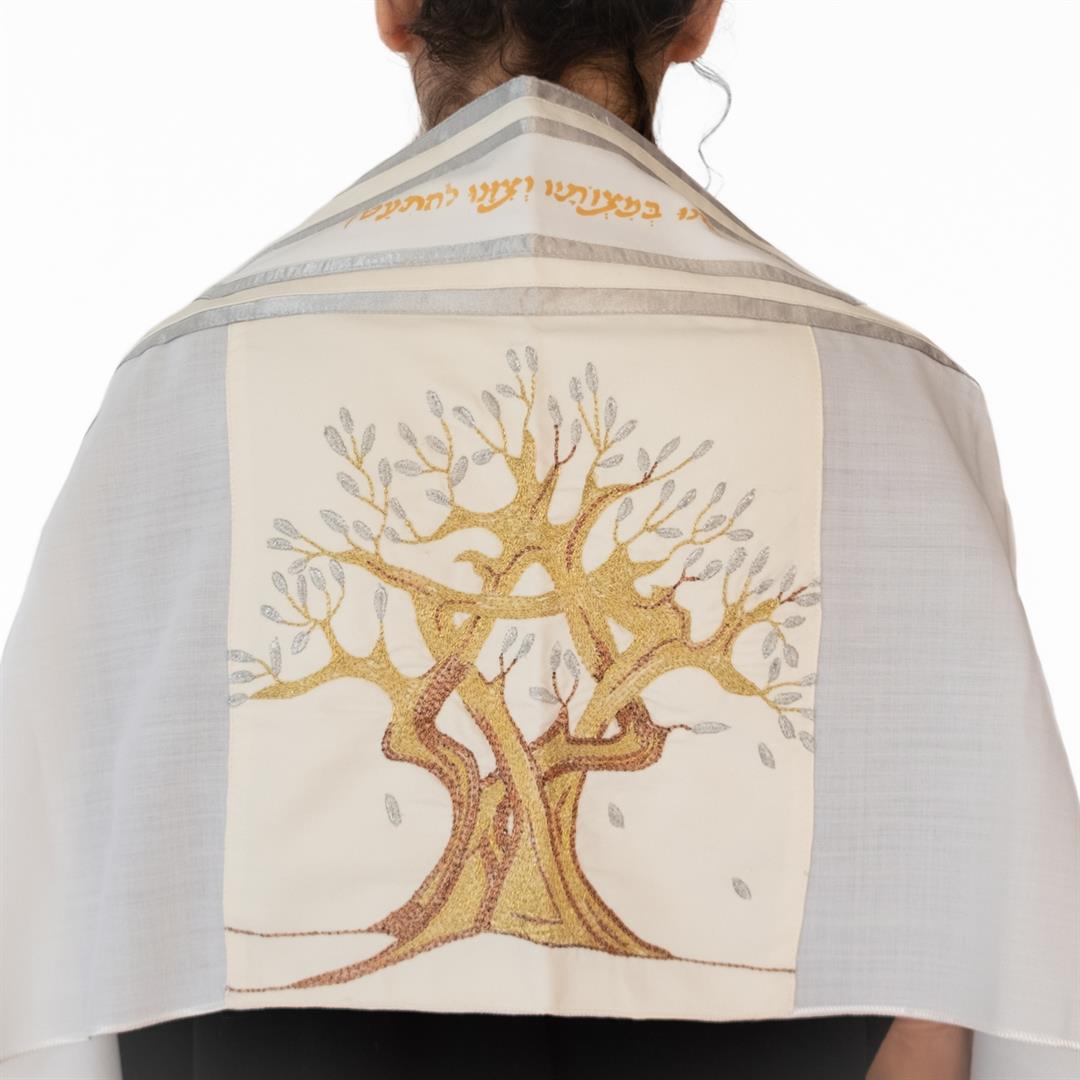 On the back is the Tree of Life, featuring a Star of David in its branches, all embroidered by hand. The atarah (neckband) is painted with part of the Hebrew blessing on the tallit: "Asher kideshanu bemitzvotav vetzivanu lehit'atef betzitzit".