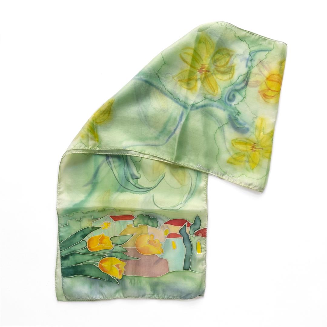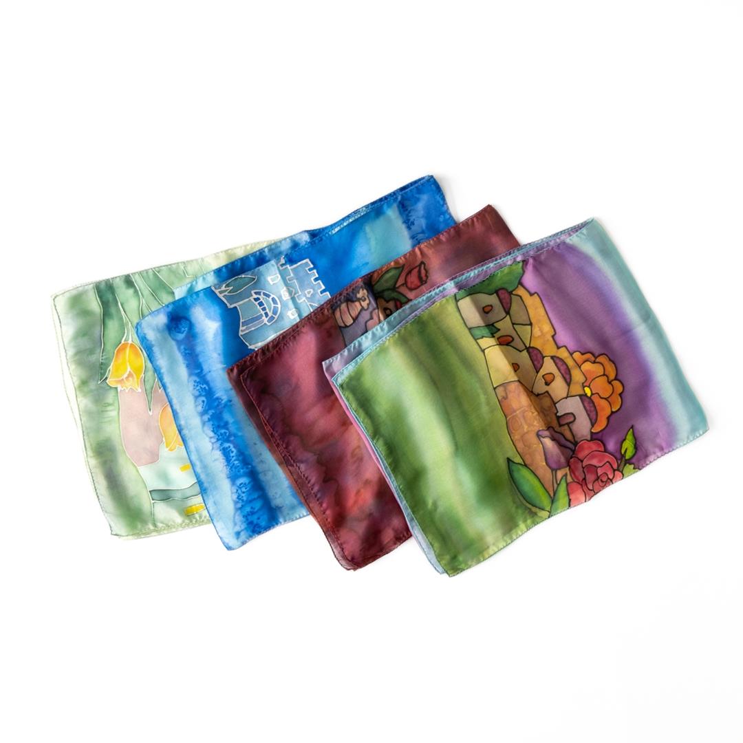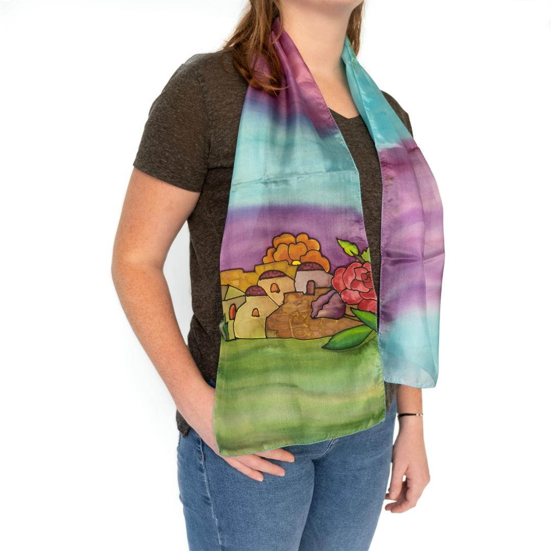 Each scarf is painted in abstract and decorated with a colorful Jerusalem scene at one end, using special silk dyes.